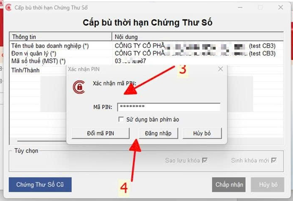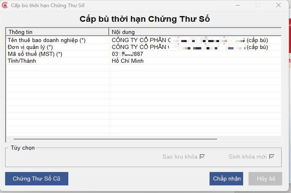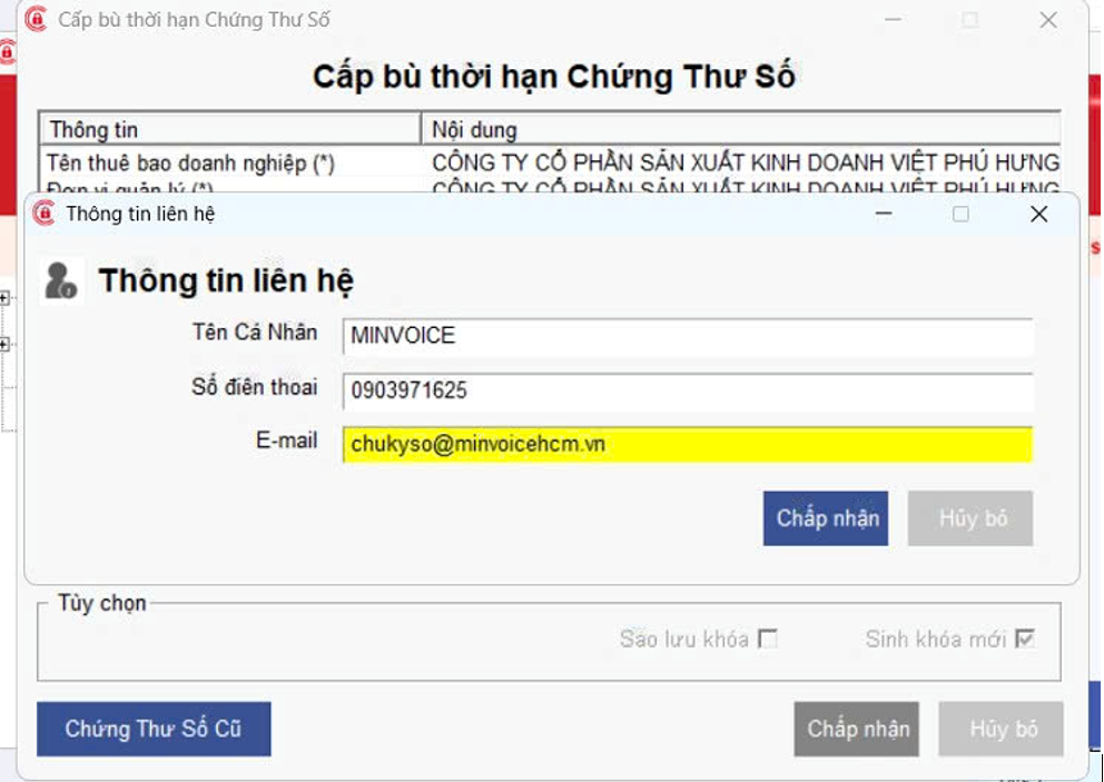 Bước 1: Cắm Token vào máy -> nhập đầy đủ thông tin liên hệ -> bấm Chấp nhận -> Popup Cấp bù thời hạn chứng thư số -> bấm Chấp nhận