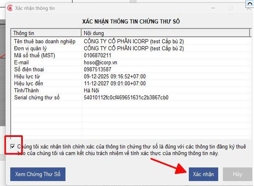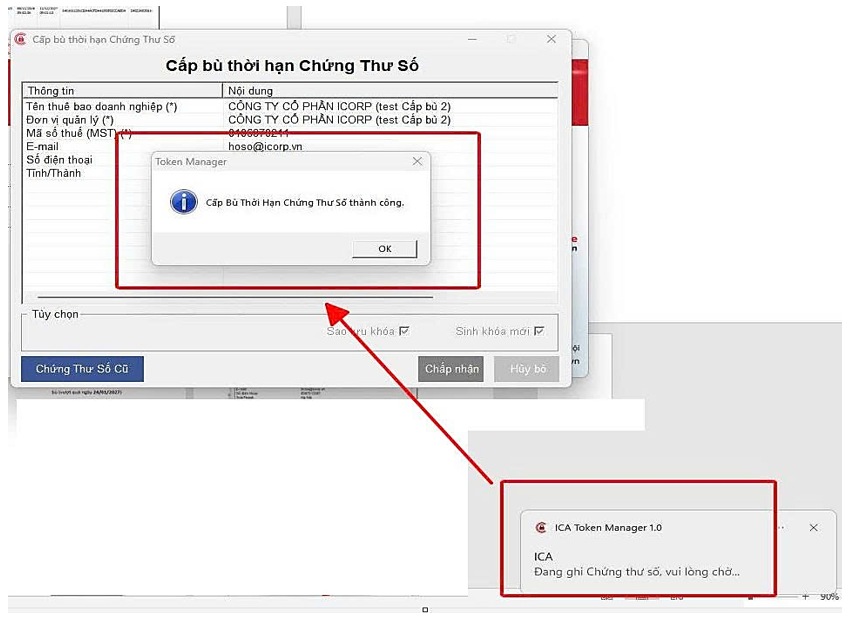 Bước 3: Tick chọn và bấm Xác nhận để xác nhận sinh khóa mới -> Bấm OK và chờ ghi CTS (luôn luôn cắm Token trong suốt quá trình thao tác) -> cấp bù thành công.