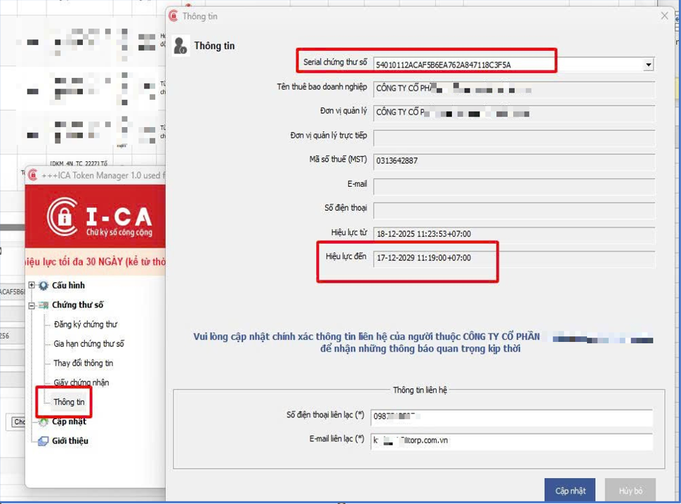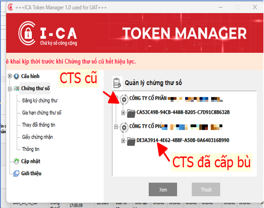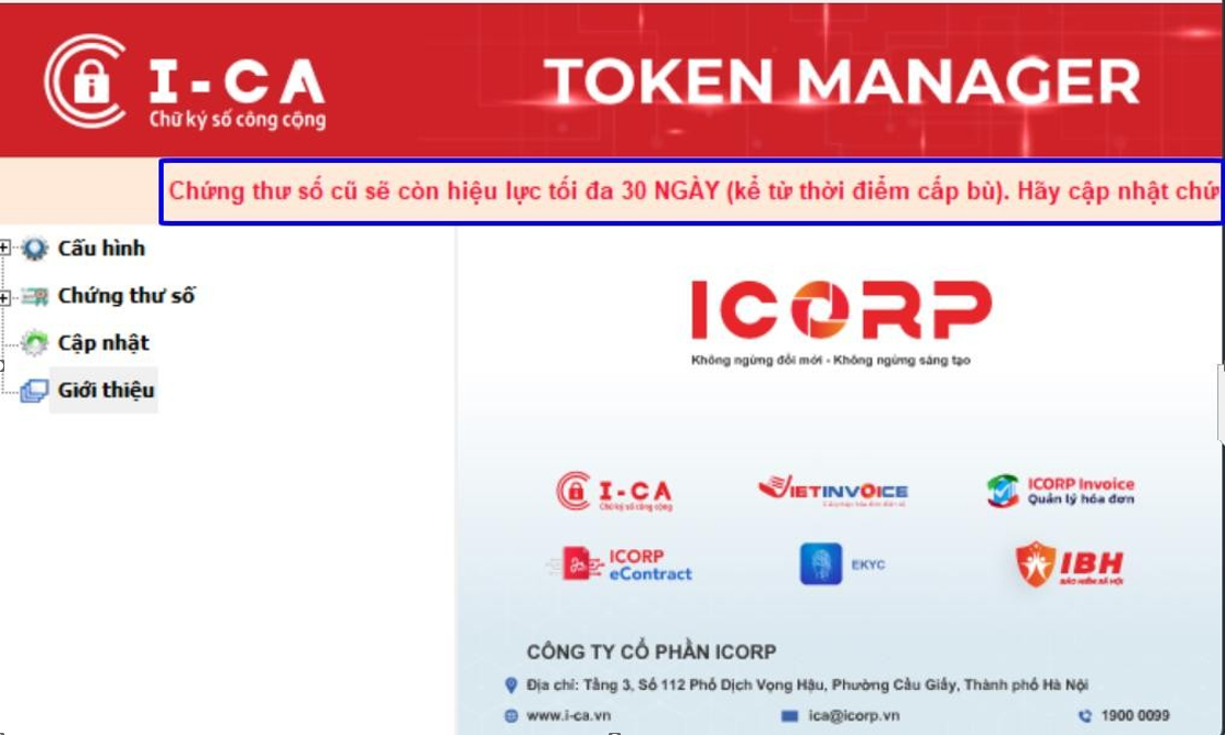 Chứng thư chữ ký số sau khi cấp bù trên Token sẽ hiển thị dòng nhắc nhở thuê bao về việc cập nhật cer lên các trang kê khai