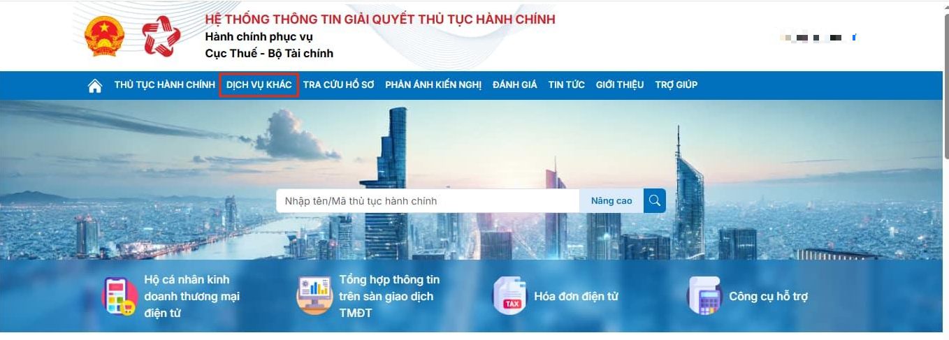 Bước 2: Lập giấy nộp tiền. Người nộp thuế chọn Mục Dịch vụ khác trên thanh tiện ích.