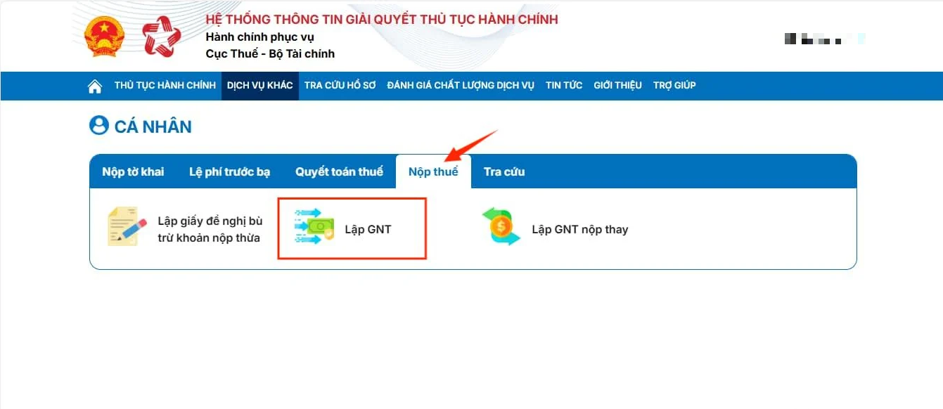 Bước 3: Chọn mục Nộp thuế và chọn Lập GNT.