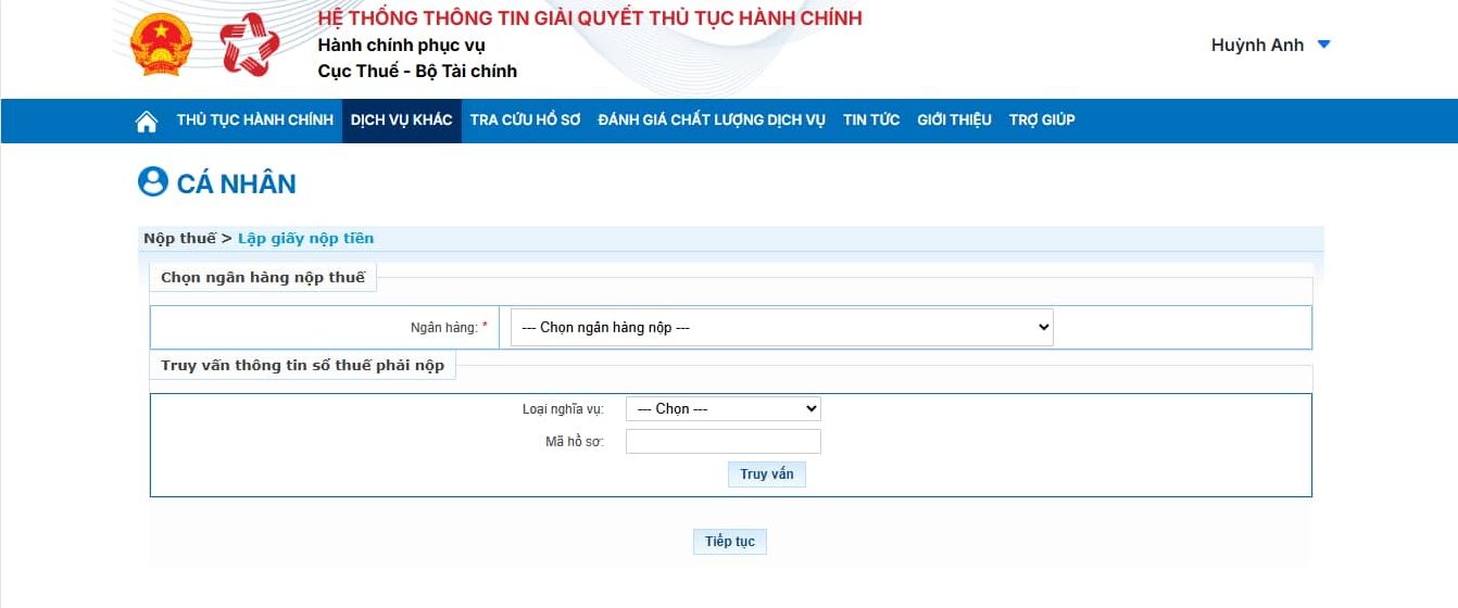 Bước 4: Hệ thống hiển thị màn hình chọn ngân hàng nộp thuế và tra cứu thông tin số thuế phải nộp gồm các thông tin về Ngân hàng, Loại nghĩa vụ, Mã hồ sơ