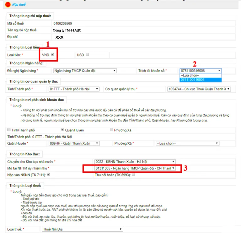 Thông tin kho bạc: Chọn chi nhánh ngân hàng dùng để đóng thuế