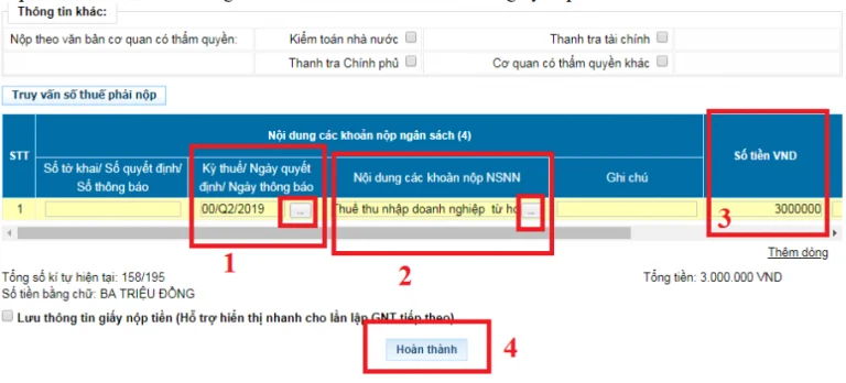 Tại mục “Số tiền VND” của bảng “Nội dung các khoản nộp ngân sách”, NNT điền số tiền thuế phải nộp là xong.