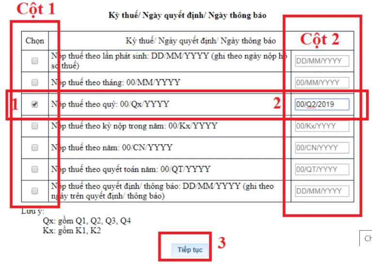 Điền cụ thể thông tin của kỳ (tháng/quý/năm) tiến hành nộp thuế ở cột 2.