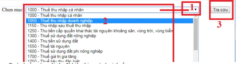 Thuế TNCN NTT chọn 1000, nhấn “Tra cứu” rồi chọn “1001 – Thuế thu nhập từ tiền lương tiền công”.