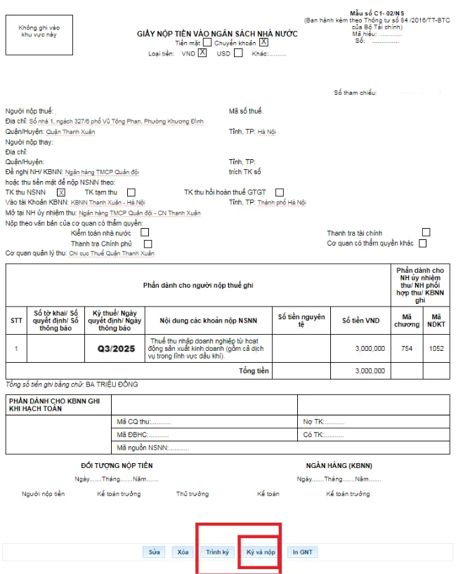 Bước 9: Kiểm tra lại thông tin vừa khai báo trong Giấy nộp tiền vào ngân sách nhà nước. Nếu thông tin đã chính xác tiếp tục nhấn Ký và nộp