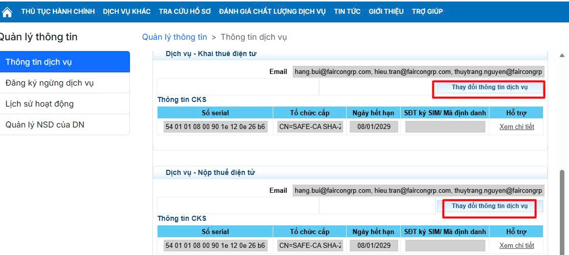 Bước 4: Sau đó anh chị chọn đến mục Dịch vụ- khai thuế điện tử hoặc dịch vụ Nộp thuế điện tử anh chị chọn thay đổi thông tin dịch vụ