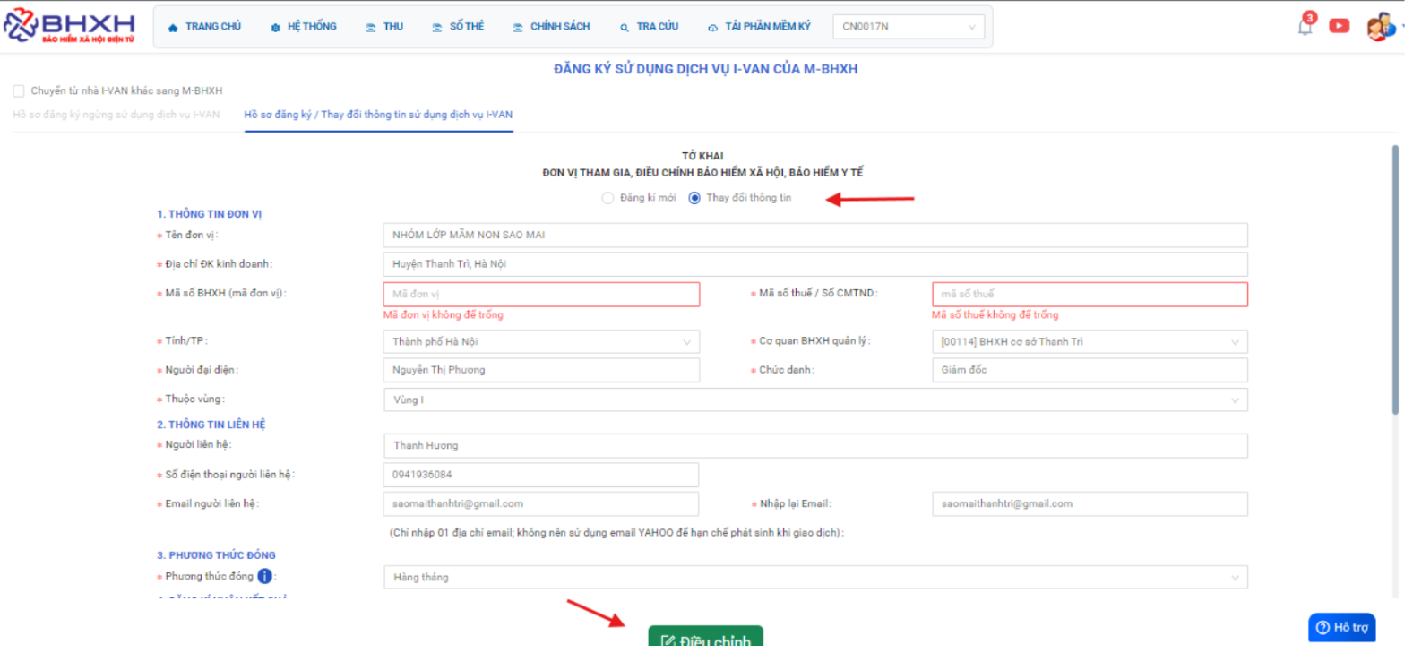 Bước 1: Vào mBHXH >> Hồ sơ đăng ký / Thay đổi thông tin sử dụng dịch vụ I-VAN >> Click chọn thay đổi thông tin