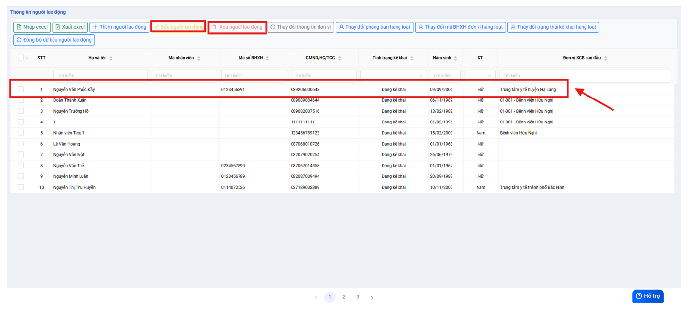 Bước 2: Tích chọn người lao động -> Chọn chức năng -> Sửa người lao động, xóa người lao động