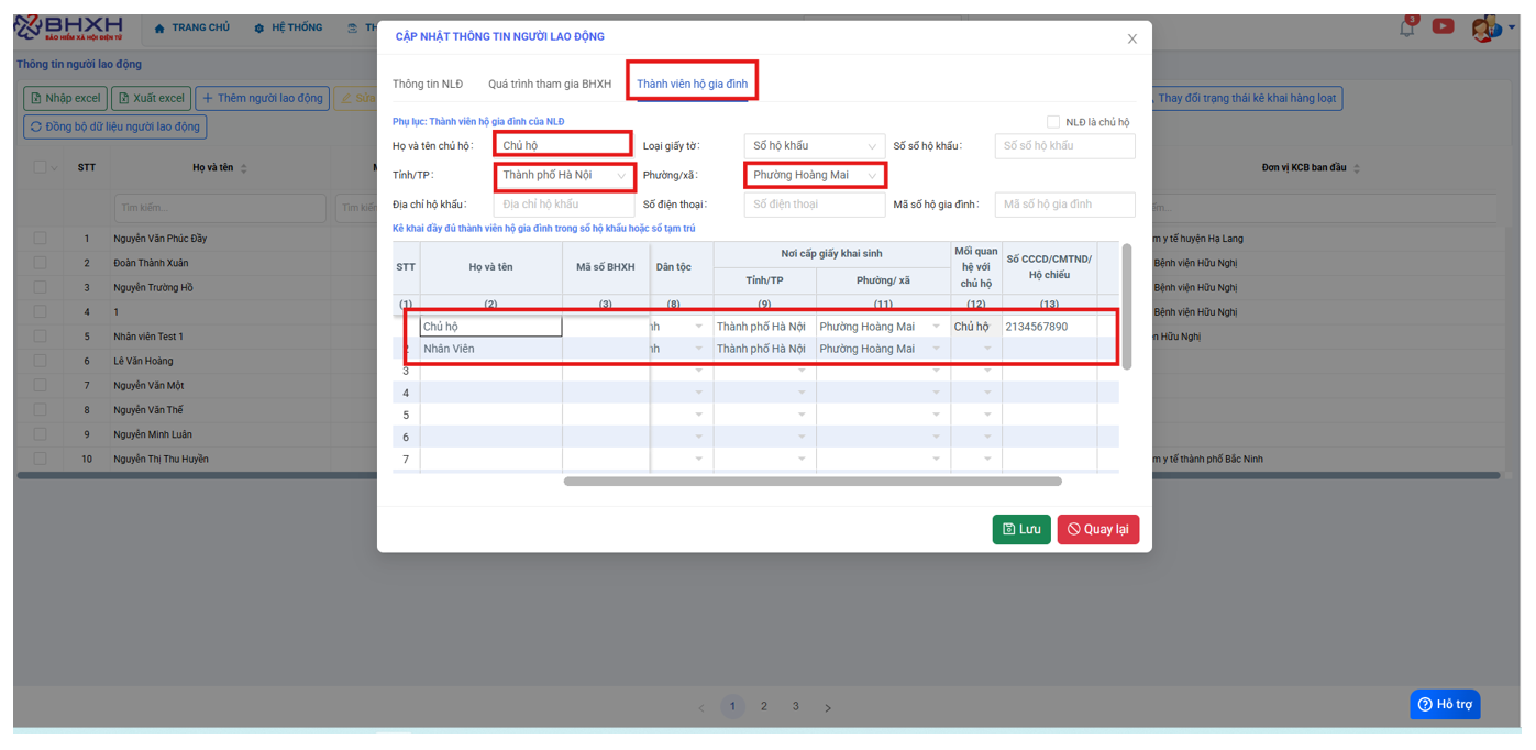 Với người lao động chưa có sổ, anh chị ấn vào thành viên hộ gia đình, và điền thông tin chủ hộ và thông tin người lao động