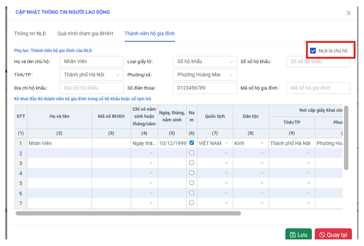 Lưu ý khi điền thông tin thành viên hộ gia đình, chỉ điền CCCD của chủ hộ. Và nếu người lao động là chủ hộ, anh chị chỉ cần tích chọn NLD là chủ hộ.