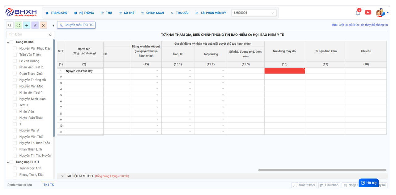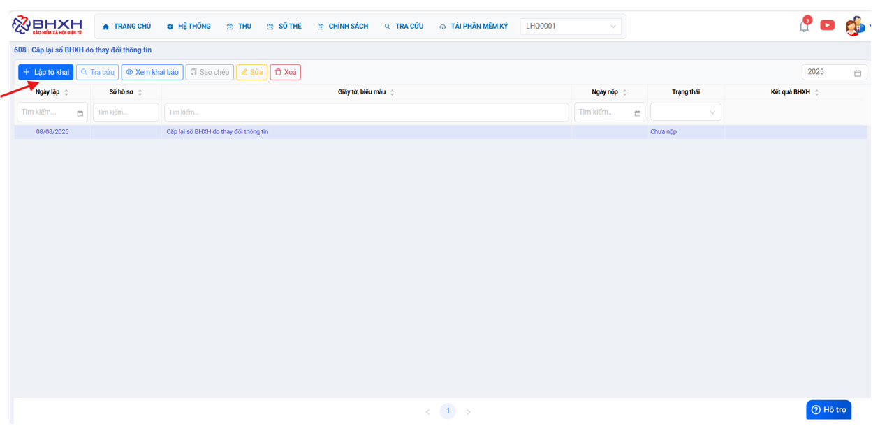 Bước 1: Anh chị chọn Sổ thẻ → Hồ sơ 608 “Cấp lại sổ BHXH do thay đổi thông tin” → ấn “Lập tờ khai”.