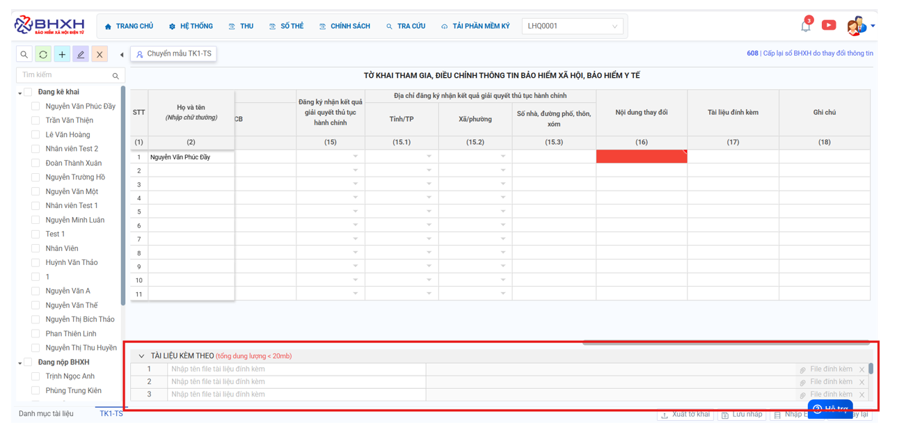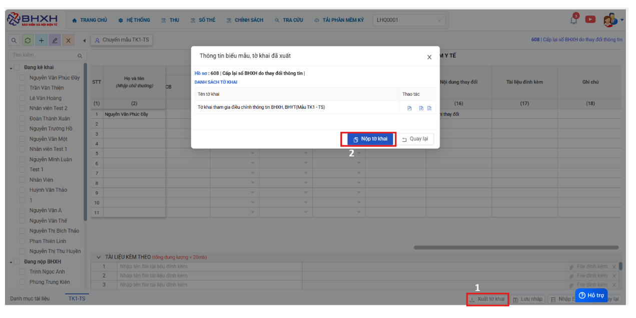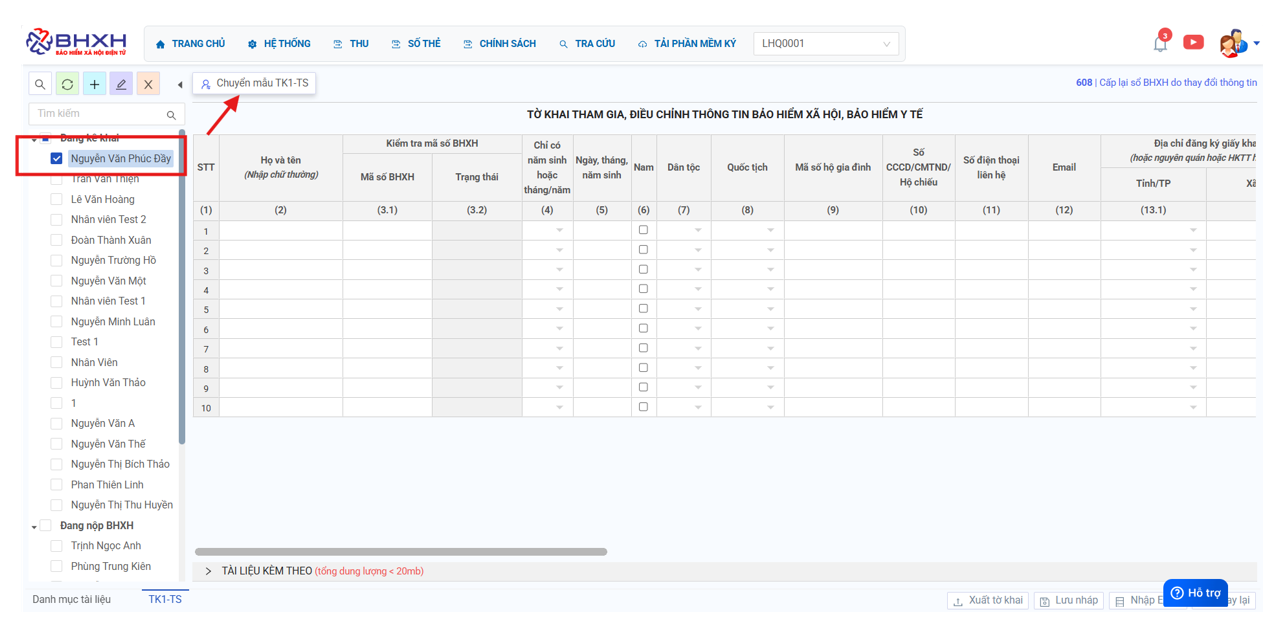 Bước 2: Anh chị tích chọn người lao động -> Ấn Chuyển mẫu TK1-TS