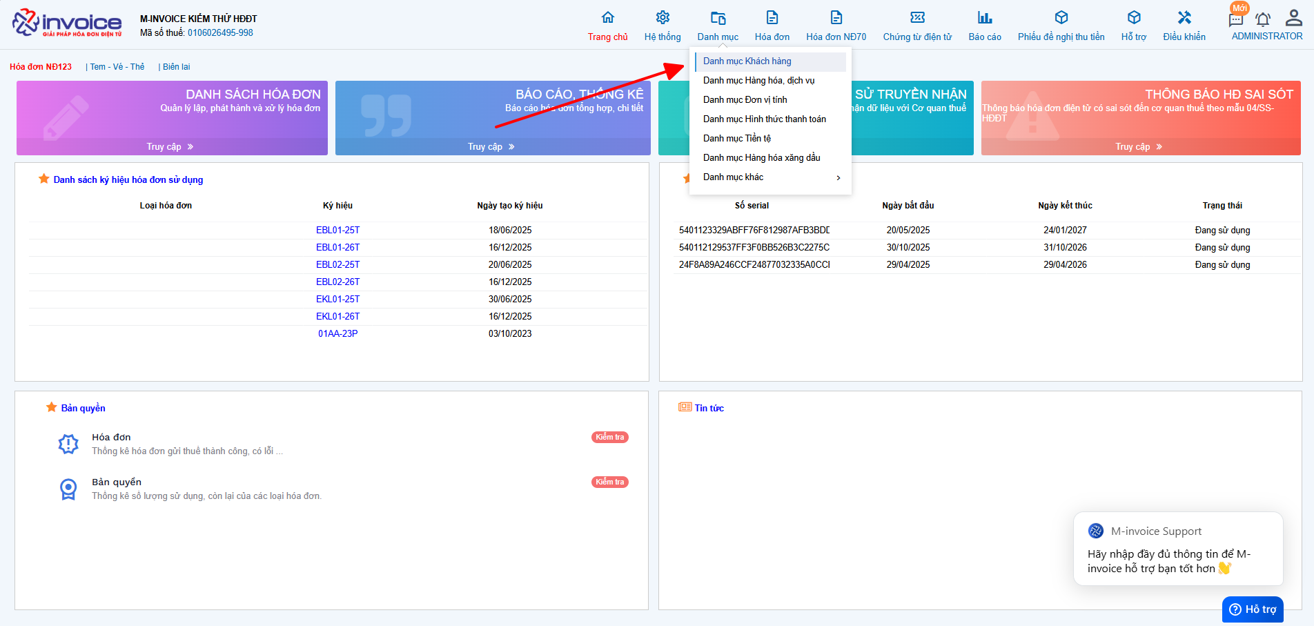 Có bất kỳ vướng mắc nào trong quá trình sử dụng hãy liên hệ với M-Invoice tại mục Hỗ trợ kỹ thuật góc phải bên dưới màn hình hoặc gọi tổng đài kỹ thuật của M-Invoice (1900.955.557 Nhánh 1)
