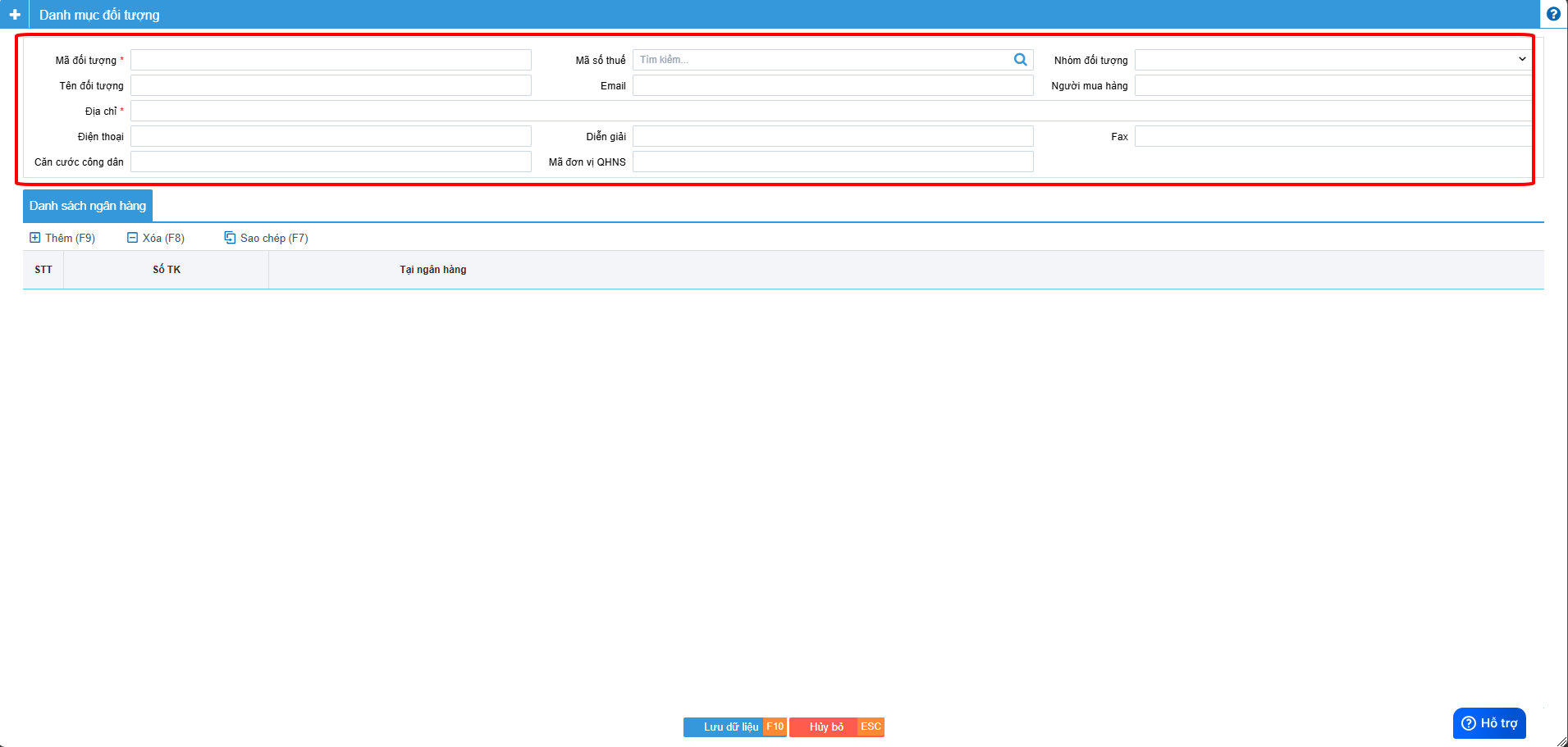 Bạn nhấn nút Thêm(F4) để bắt đầu thêm Khách hàng Nhập đầy đủ thông tin như Mã đối tượng, mã số thuế, Tên đơn vị, Địa chỉ .... Khi nhập xong bạn nhấn Lưu để lưu hàng mã đối tượng khách hàng này vào