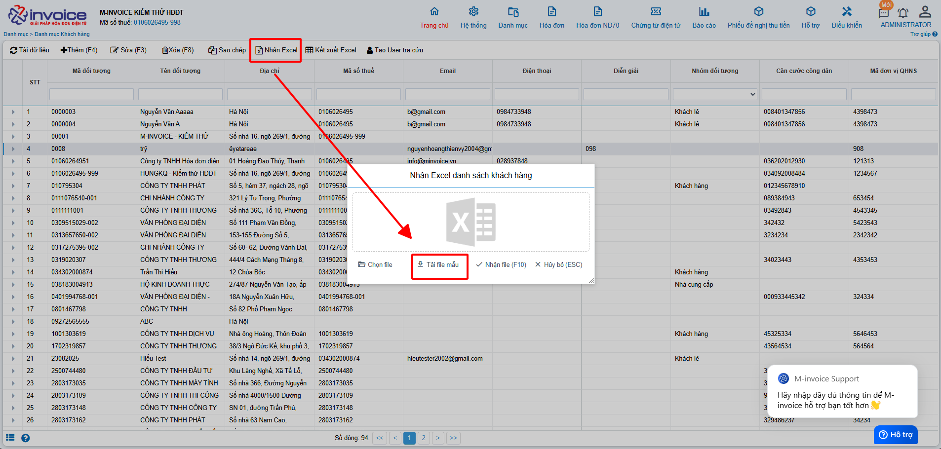 Trên giao diện Danh mục khách hàng bạn chọn Nhận Excel, sau đó nhấn Tải file mẫu