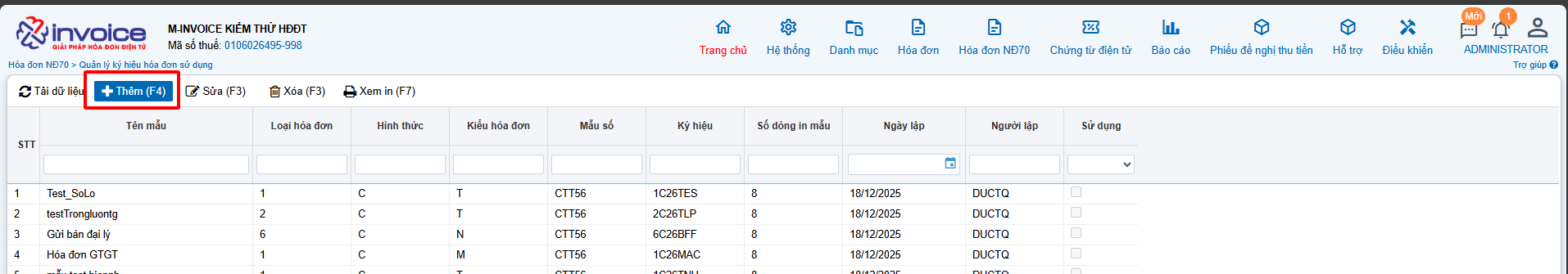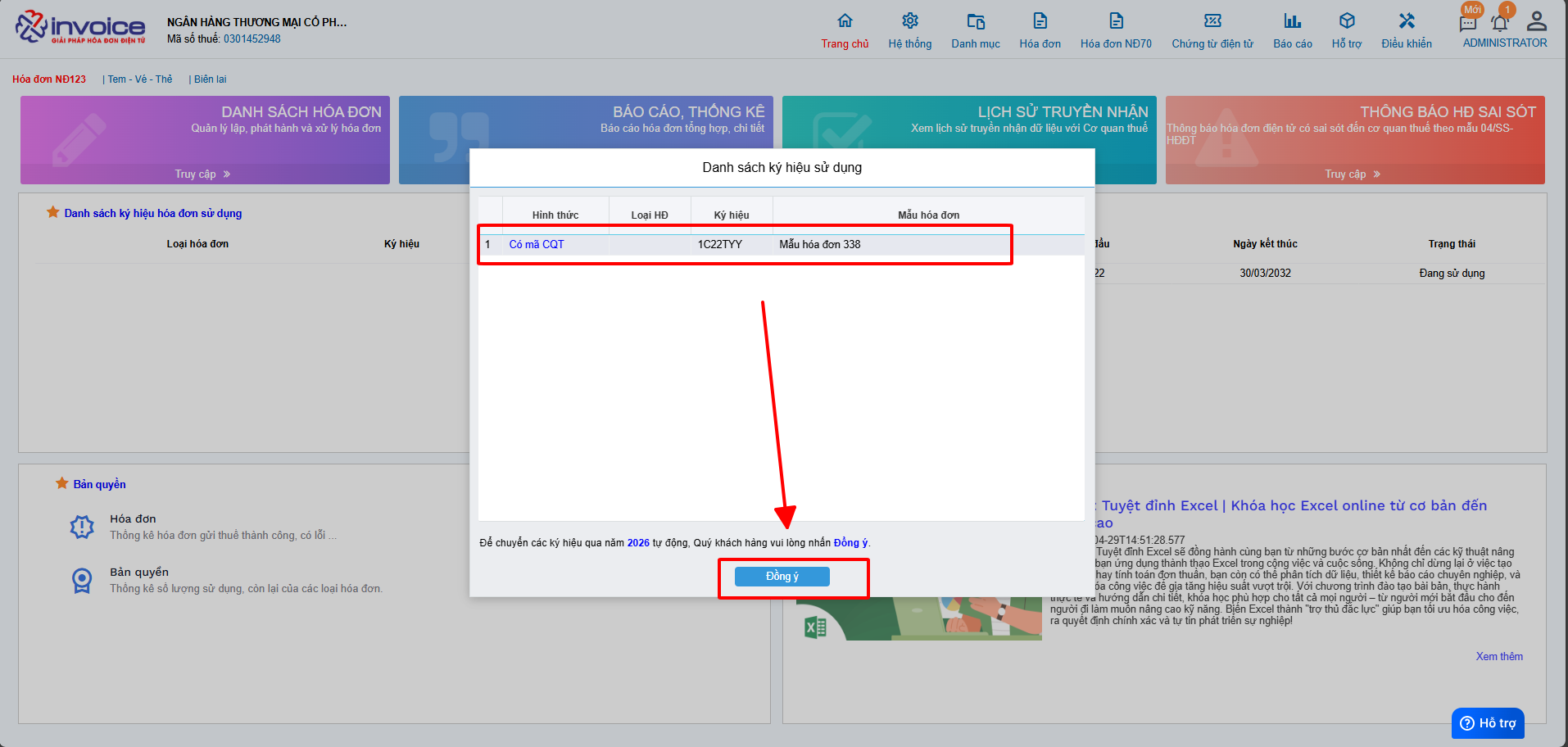 Load lại trang và truy cập danh sách hóa đơn để thấy ký hiệu vừa tạo