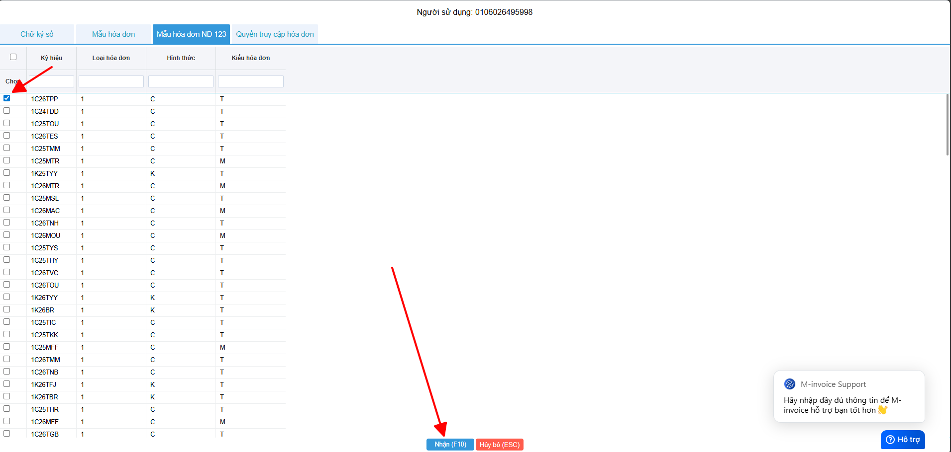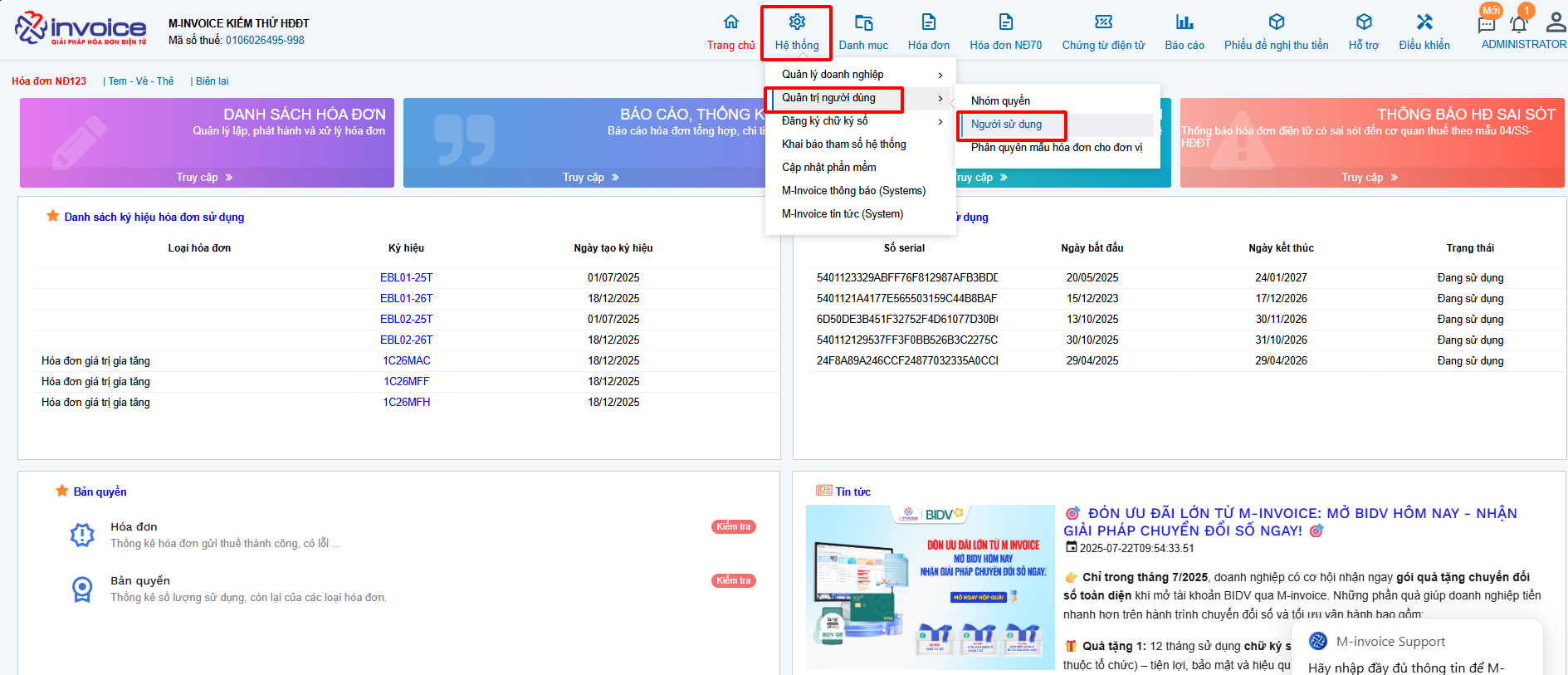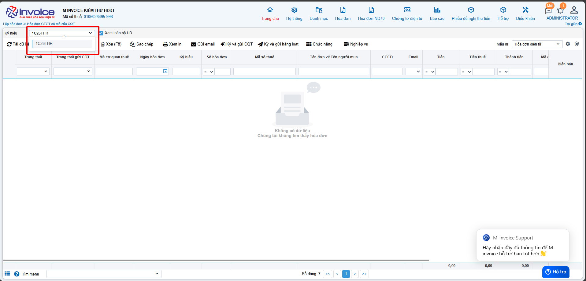 Có bất kỳ vướng mắc nào trong quá trình sử dụng hãy liên hệ với M-Invoice tại mục Hỗ trợ kỹ thuật góc phải bên dưới màn hình hoặc gọi tổng đài kỹ thuật của M-Invoice (1900.955.557 Nhánh 1)