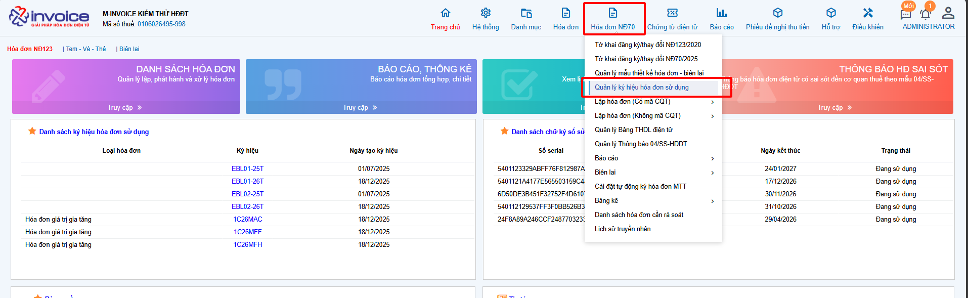 Truy cập vào Hóa đơn NĐ70 -> loại hóa đơn tương ứng ở phần ký hiệu sẽ thấy ký hiệu của năm 2026 -> khi bước sang 2026 anh chị chọn đúng ký hiệu này và xuất hóa đơn