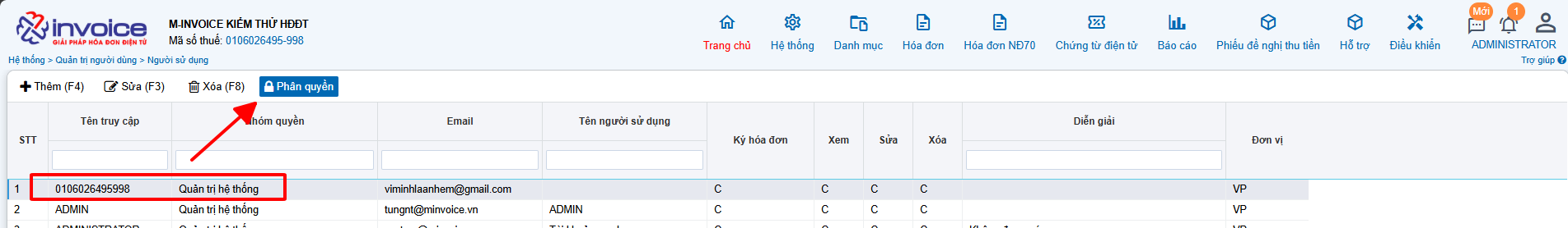 Bấm vào tài khoản đang sử sụng -> Phân quyền