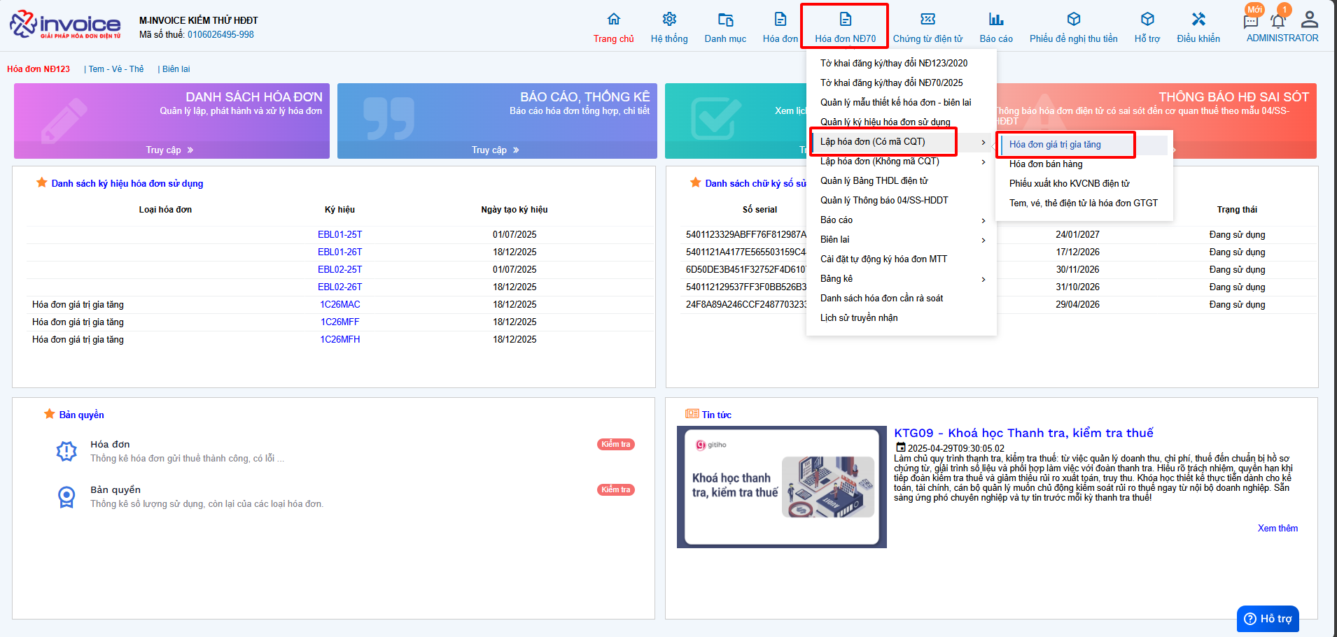Chọn hóa đơn từ ngày đến ngày, điền MST của đơn vị mà bán hàng ra