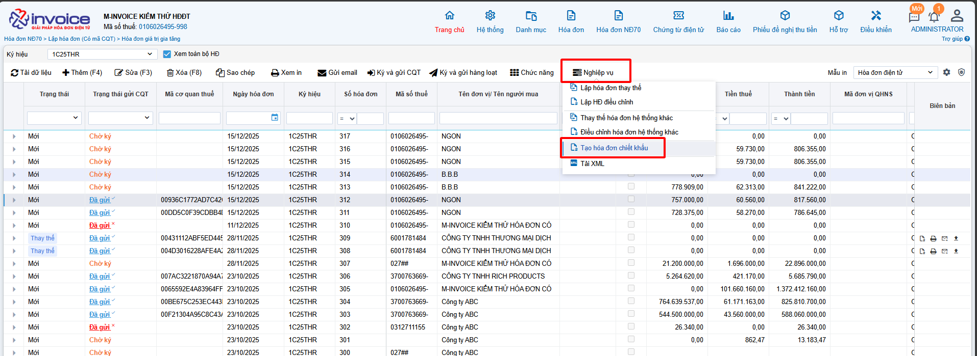 Bước 1: Truy cập vào danh sách hóa đơn -> Thêm HĐ chiết khấu