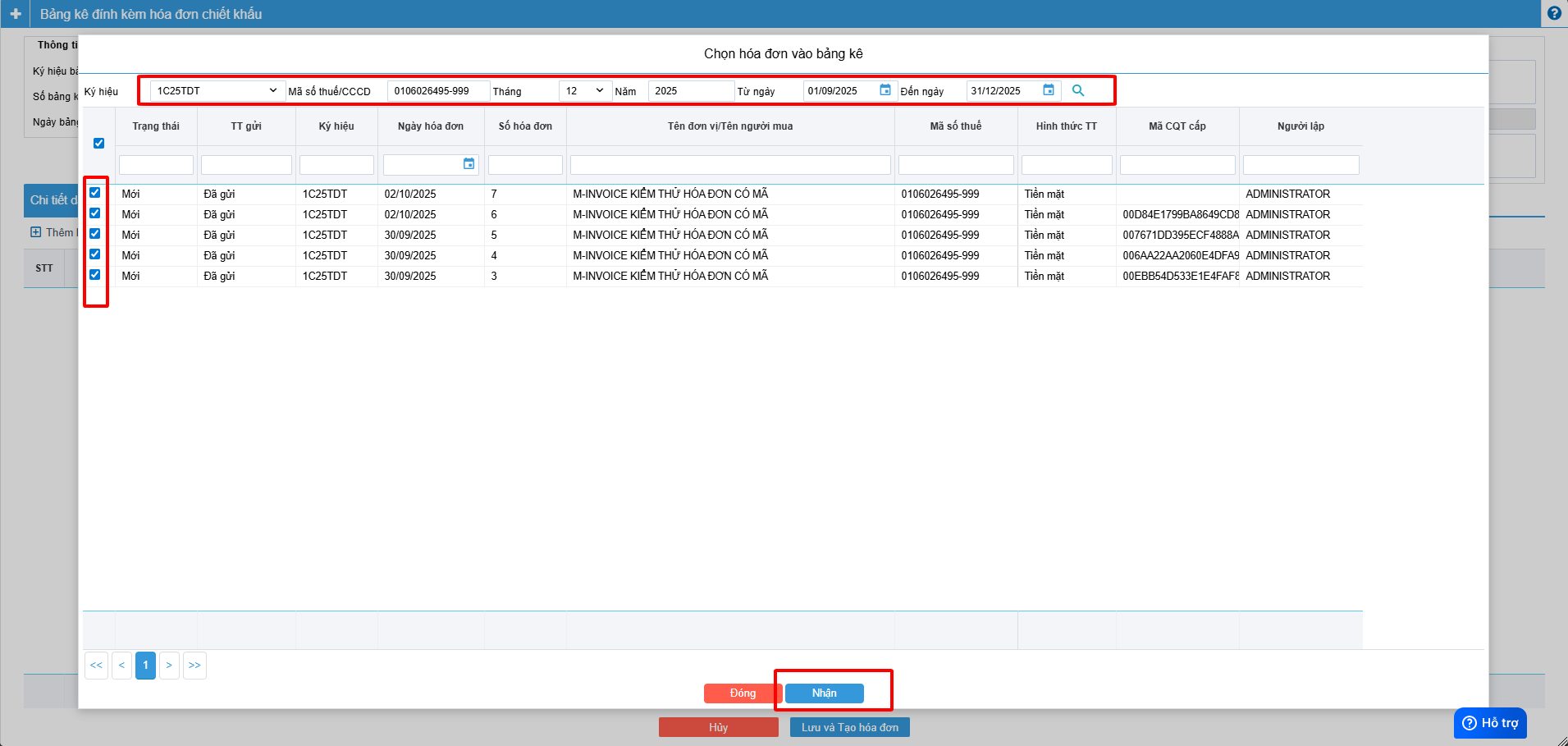 Anh chị bấm chọn Lập bảng kê đính kèm