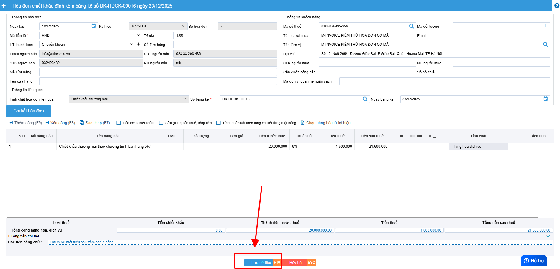 Nhấn Lưu và tạo hóa đơn