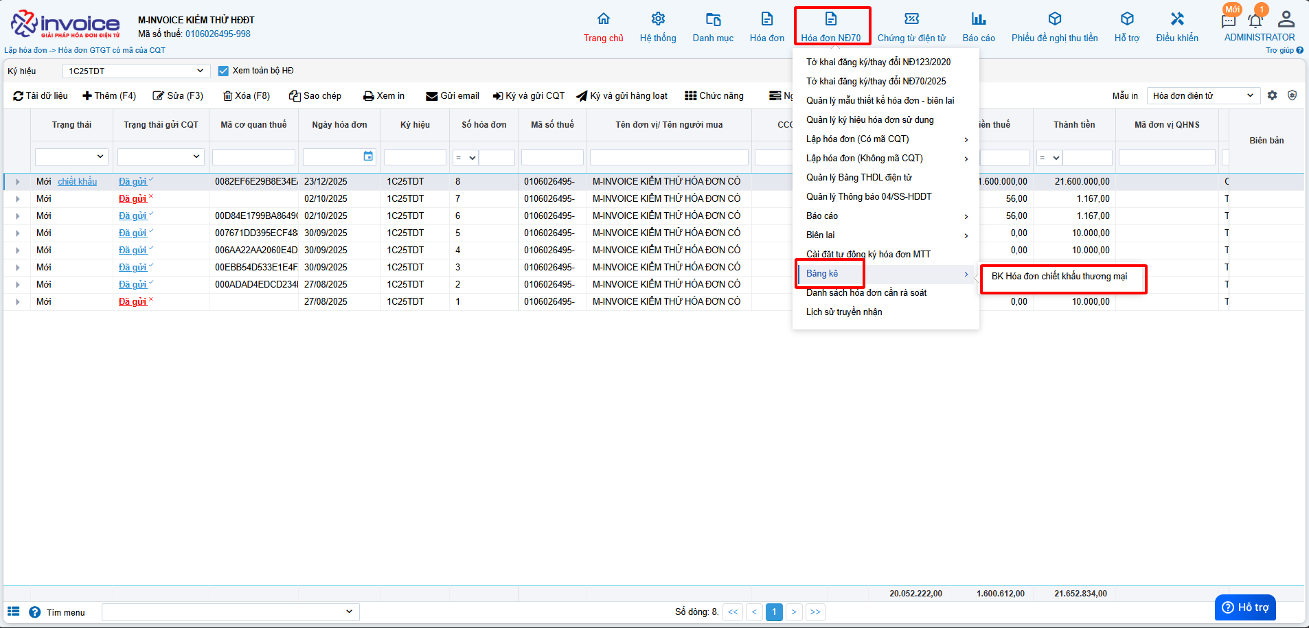 Truy cập phân hệ Hóa đơn NĐ70 -> Bảng kê -> BK hóa đơn chiết khấu thương mại