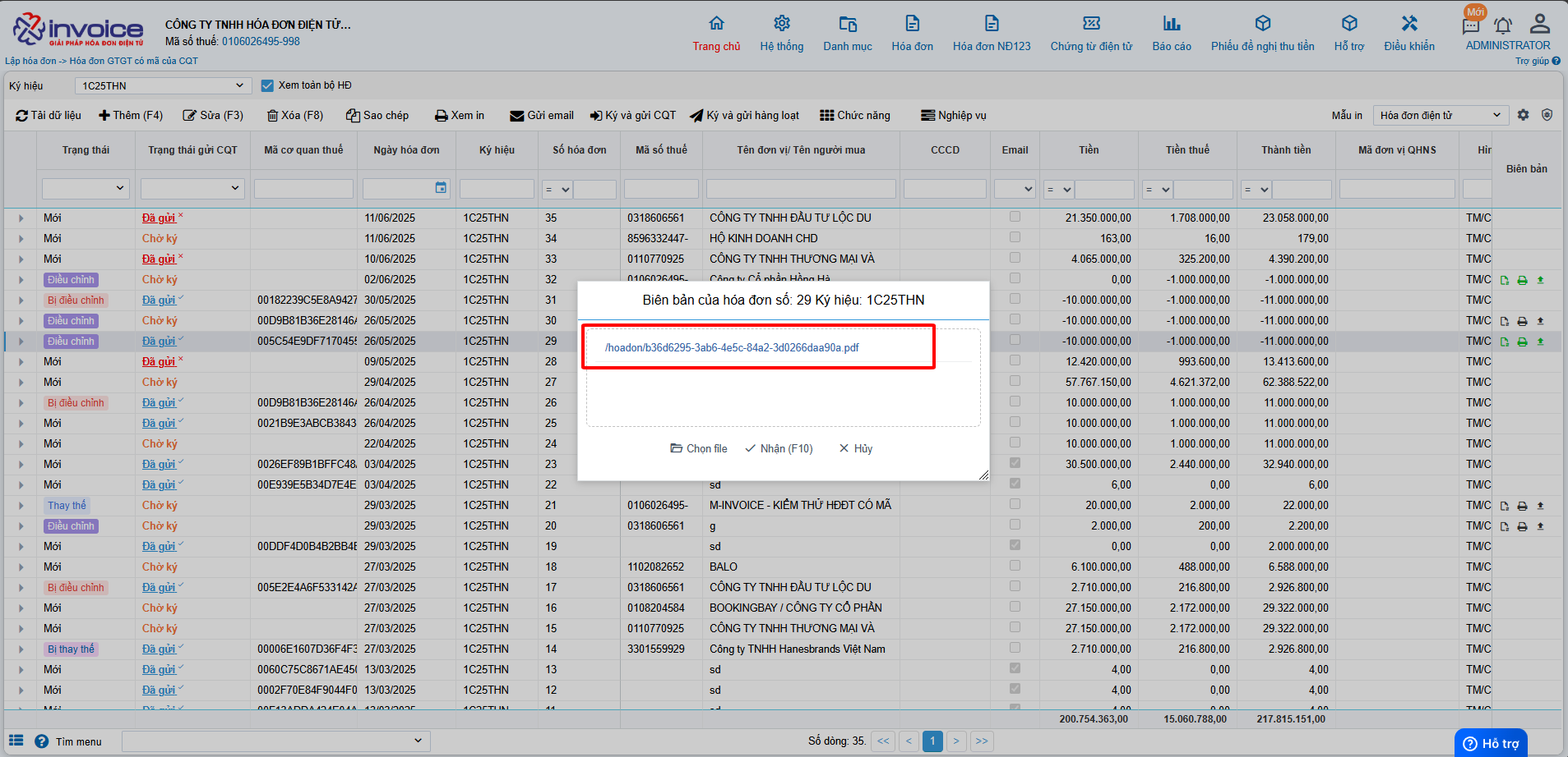 Bước 5 : Sau khi gửi cho khách hàng ký anh chị có thể up mẫu biên bản 2 bên đã ký lên phần mềm