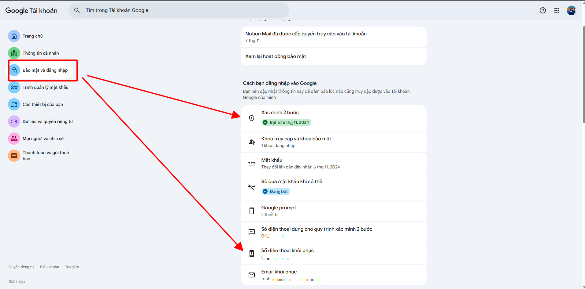 2. Tích chọn vào Bảo mật (Security) để xem mail của bạn đã bật xác thực 2 bước và điền số điện thoại chưa, nếu chưa hãy thực hiện