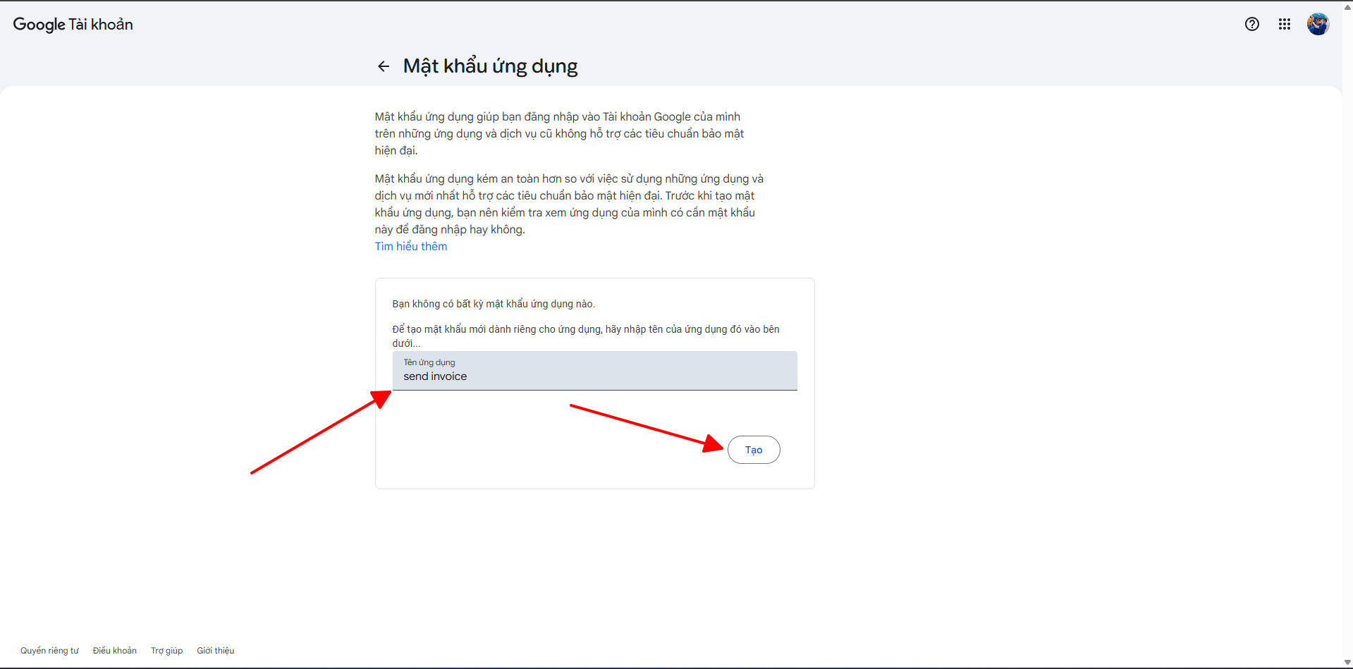 1. Truy cập theo đường link sau để tạo mật khẩu ứng dụng cho gmail Tài khoản Google