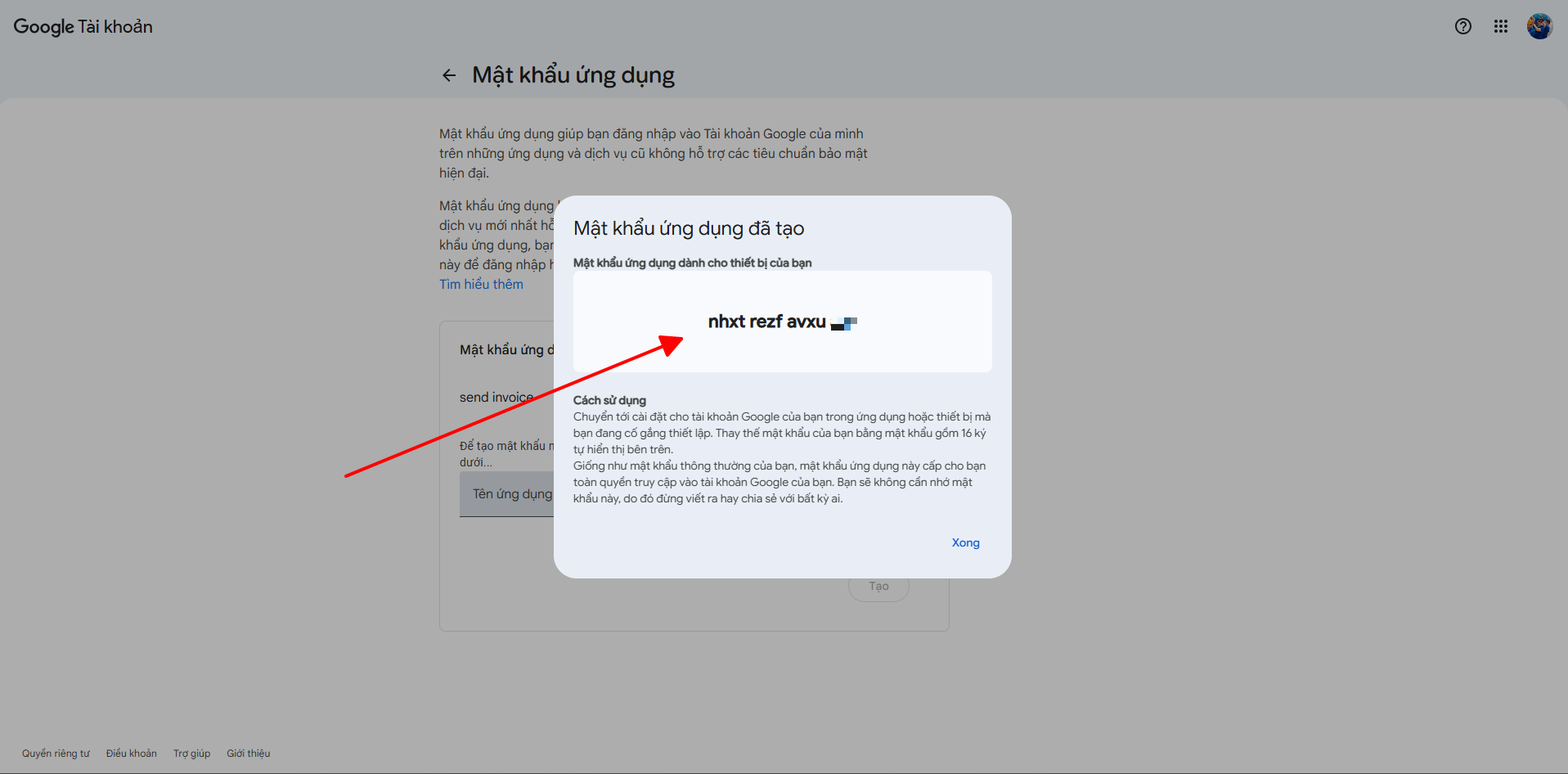 Copy đoạn mật khẩu ứng dụng đã được tạo -> nhấn Xong