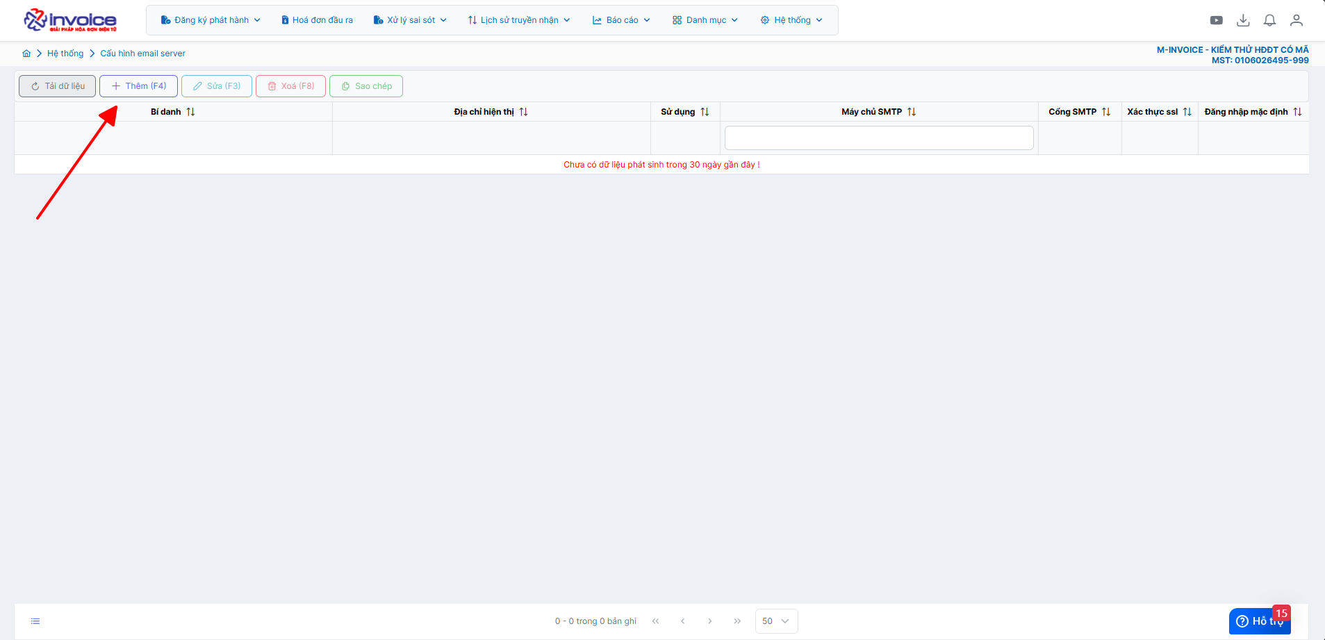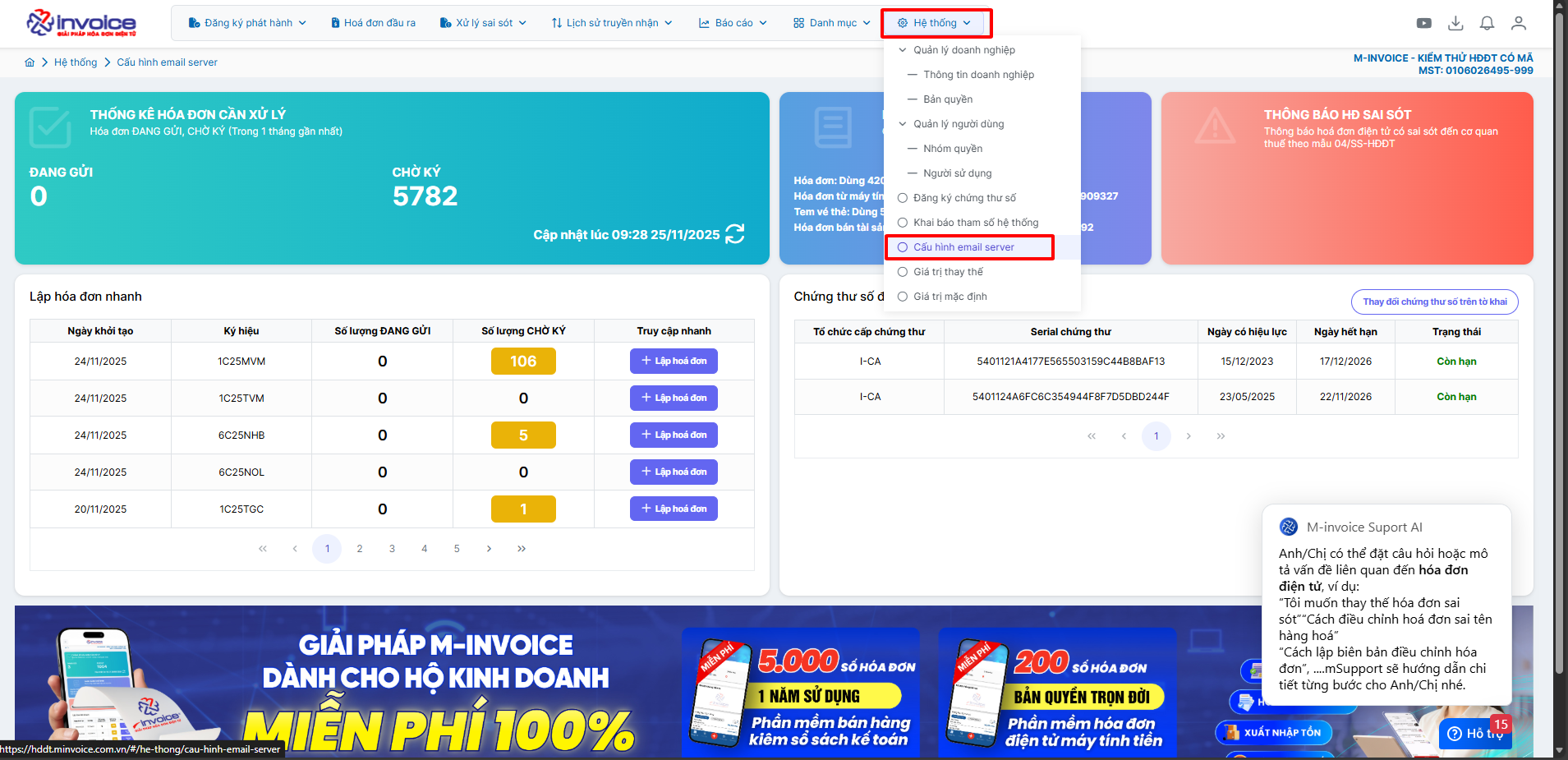 Bước 2: [Thao tác ở phần mềm hóa đơn điện tử M-invoice] truy cập Hệ thống - Cấu hình email server