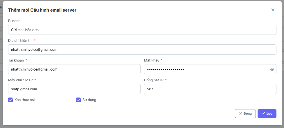 Dưới đây M-invoice xin phép được hướng dẫn cấu hình qua Gmail, các cấu hình khác vui lòng tham khảo IT để thực hiện thêm