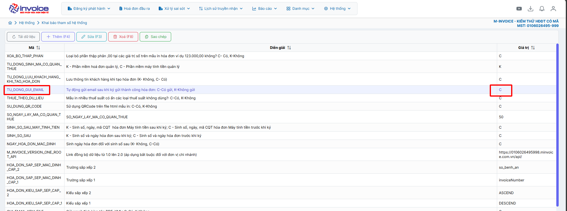 Gửi email tự động: trường hợp anh muốn gửi mail tự động sau khi ký. Anh/Chị truy cập mục Hệ thống - Khai báo tham số hệ thống tìm mã TU_DONG_GUI_EMAIL sửa thành C Lưu ý: để gửi được mail tự động anh chị cần phải điền sẵn mail người mua ở hóa đơn.