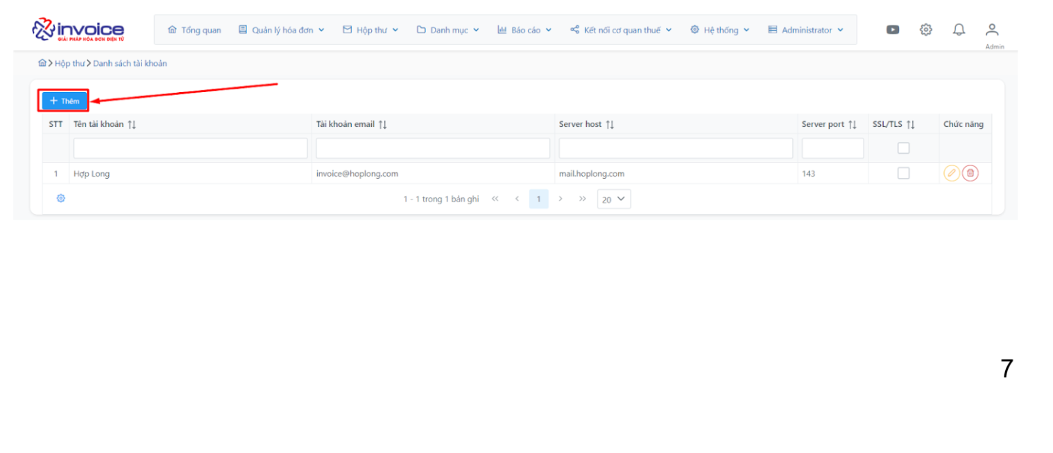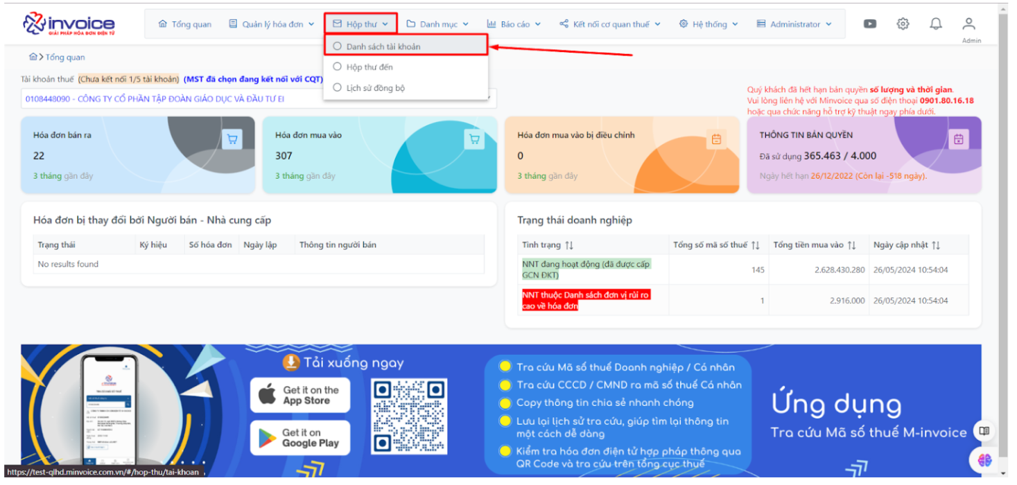 Đăng nhập vào trang Quản lý hóa đơn mSMI chọn Hộp thư -> Danh sách tài khoản
