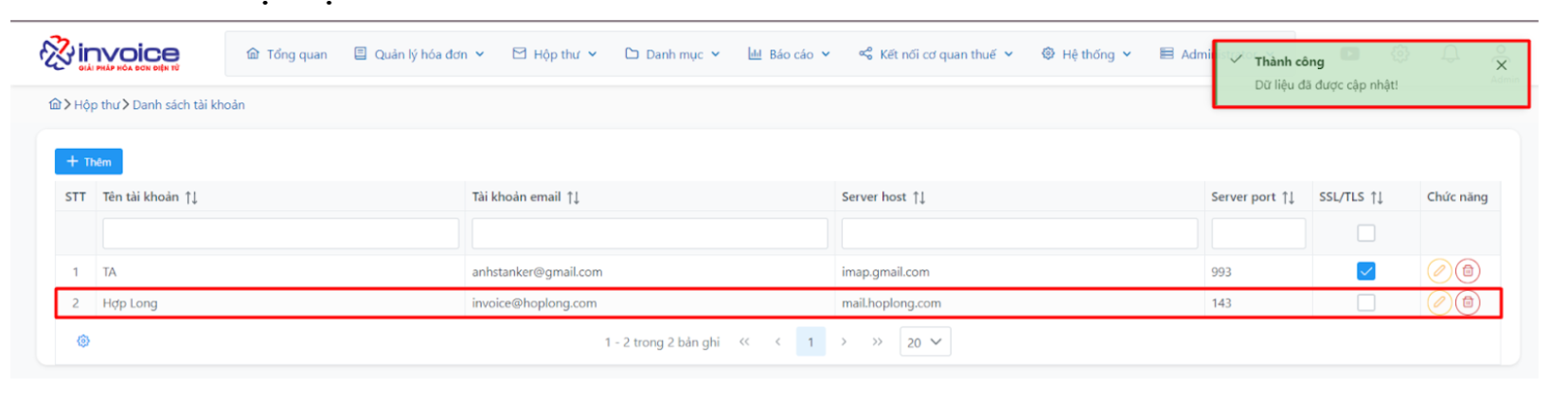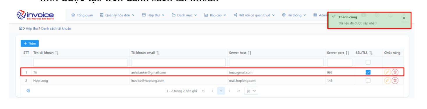 - Sau khi lưu màn hình trả về giao diện Danh sách tài khoản, có thông báo thành công ở góc trên bên phải màn hình và có thông tin tài khoản nhận mail mới được tạo trên danh sách tài khoản