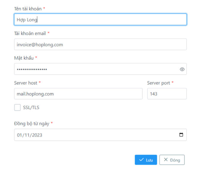 Tài khoản Email | Tài khoản Email sử dụng để đồng bộ mail | invoice@hoplong.com |