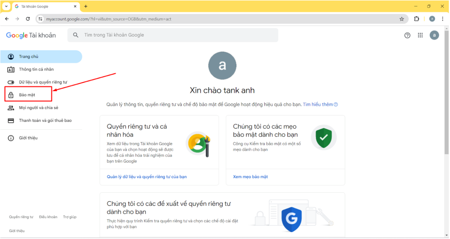 - Sau khi màn hình đổi đến giao diện Quản lý tài khoản click vào phần Bảo mật