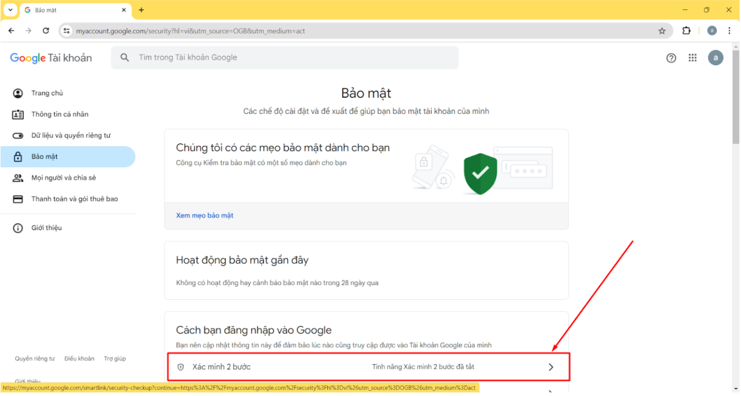 - Chọn Xác minh 2 bước trong phần Bảo mật và bật nó lên