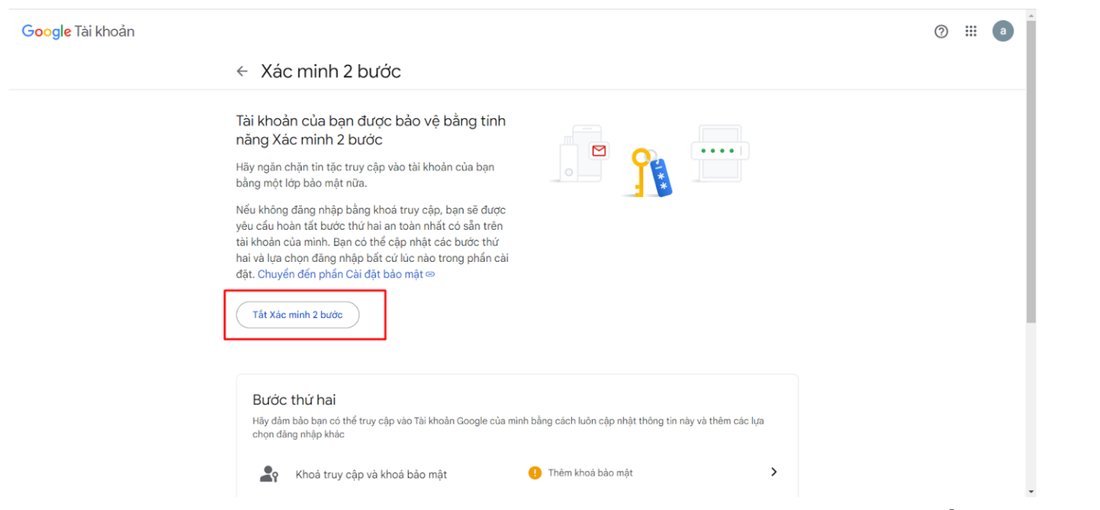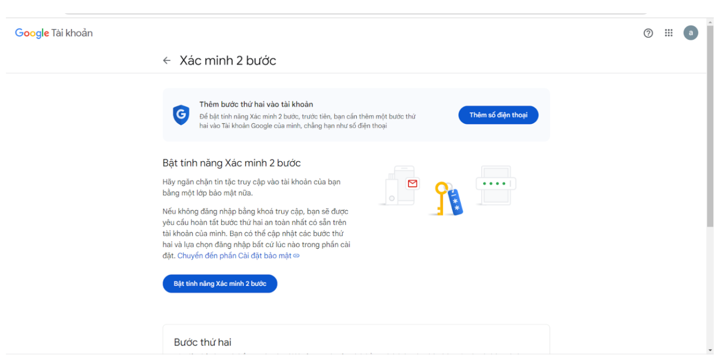 - Thêm số điện thoại và các khóa khác ta có thể click vào nút Bật tính năng Xác minh 2 bước để khởi động tính năng xác minh 2 bước