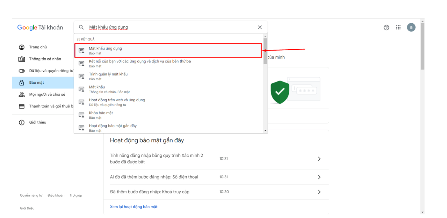 - Quay lại phần tìm kiếm trong quản lý tài khoản và tìm từ khóa Mật khẩu ứng dụng và click vào đó