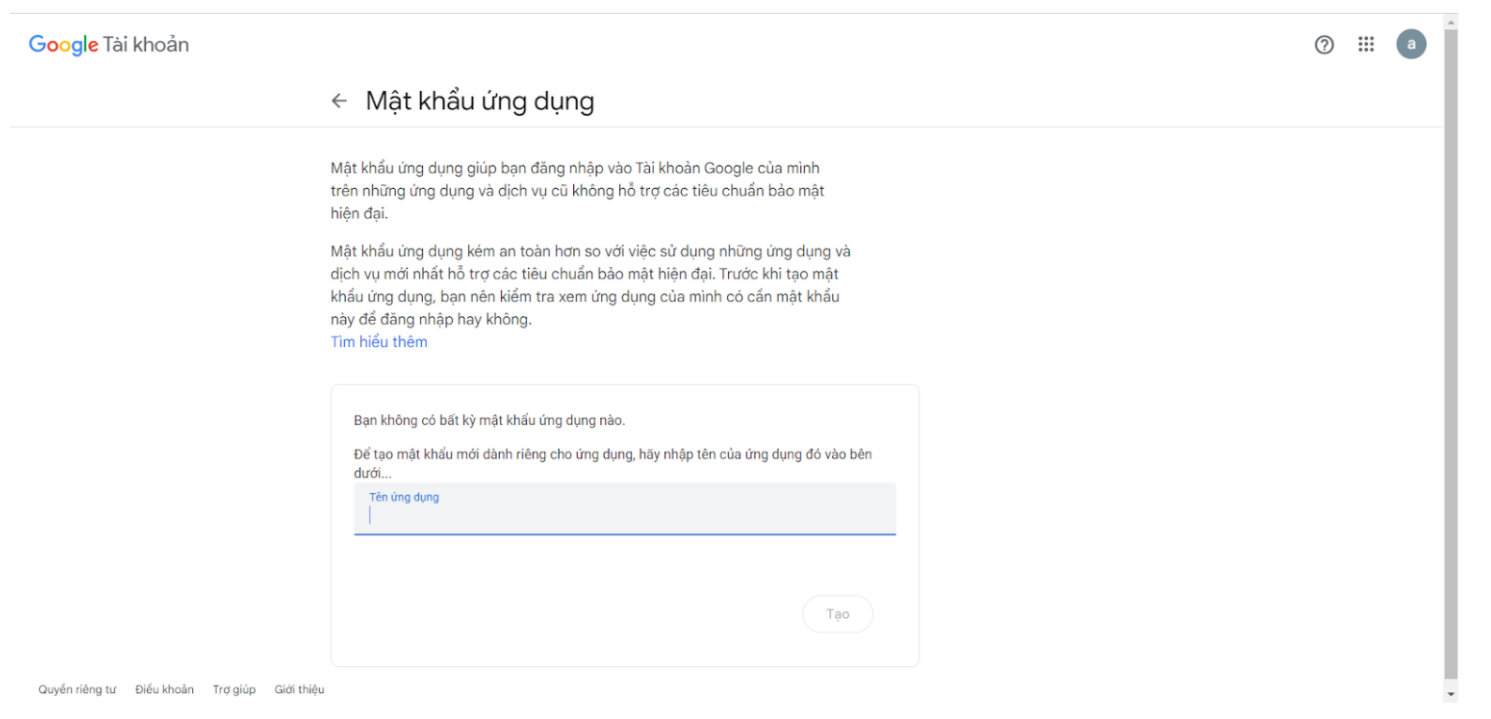 - Sau khi click vào Mật khẩu ứng dụng web sẽ hiển thị màn hình Mật khẩu ứng dụng