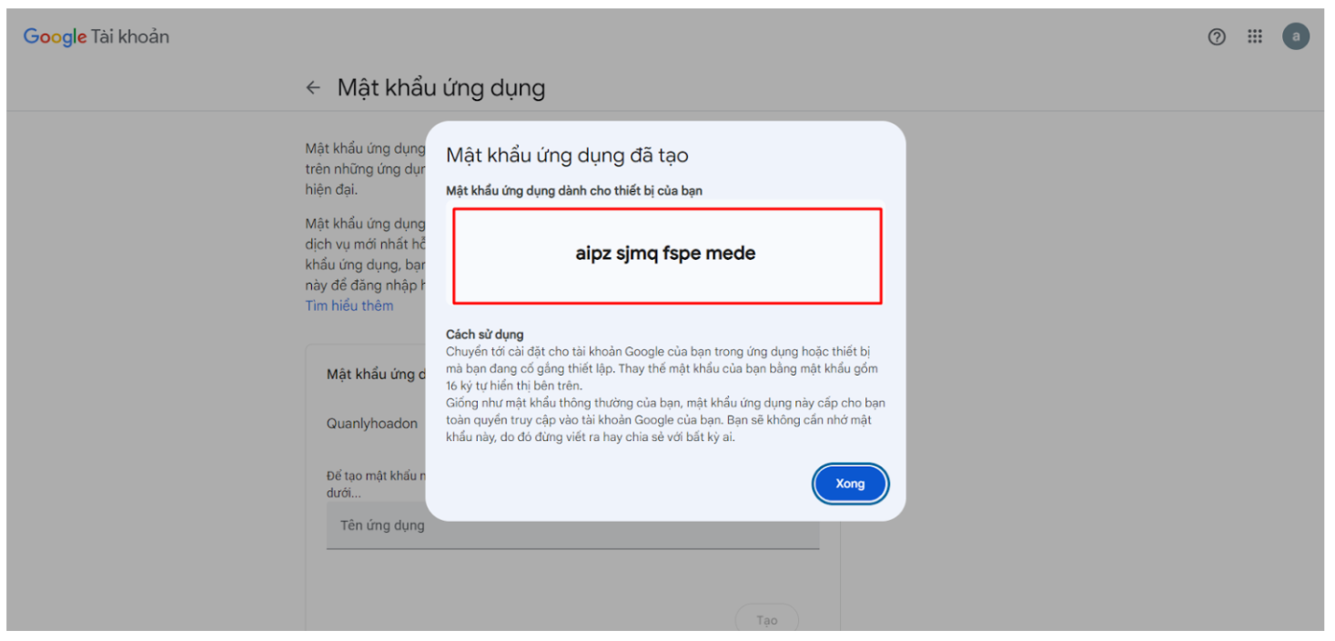 - Nhập tên của ứng dụng cần tạo mật khẩu ứng dụng. Ví dụ nhập tên ứng dụng mSMI là Quanlyhoadon và click nút Tạo. Màn hình sẽ hiển thị mật khẩu ứng dụng được tạo cho ứng dụng này.