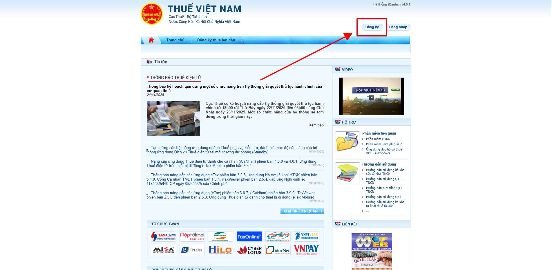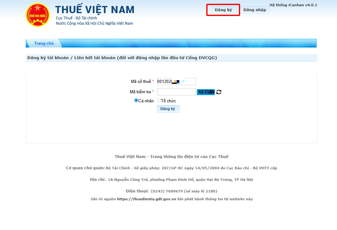 Bước 2: Người nộp thuế (NNT) nhấp vào Đăng ký