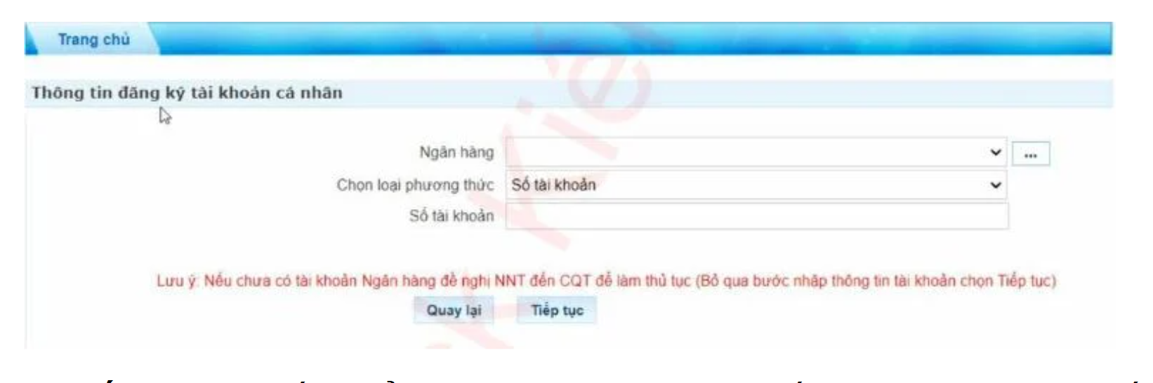 Bước 5: Chọn Tiếp tục, hệ thống hiển thị màn hình liên kết tài khoản ngân hàng, NNT nhập thông tin ngân hàng, loại phương thức và số tài khoản ngân hàng,