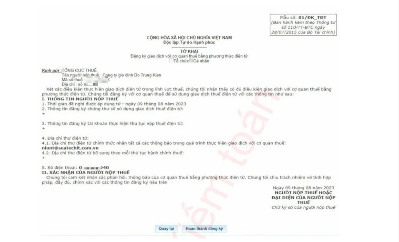 Mã số thuế: Tự động hiển thị MST đã nhập ở bước trước.